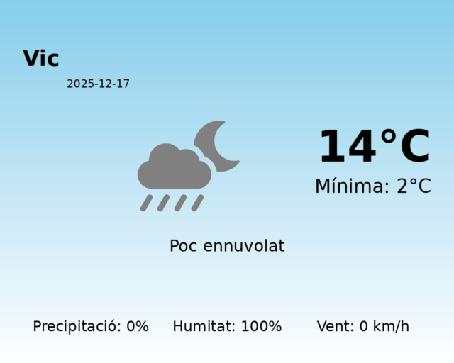 Avui, dimarts 17 de desembre de 2025, Vic es prepara per a un dia fresc però majoritàriament tranquil. Les temperatures a la ciutat oscil·laran entre un mínim de 2 graus i un màxim de 14 graus Celsius. Tot i que el matí pot començar amb una mica de fred, s’espera que al llarg del dia la temperatura incrementi fins a ser moderadament càlida per a aquesta època de l’any.