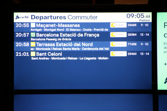 ACN Barcelona – Les pantalles de l’estació de Sants han mostrat aquest diumenge a primera hora alguns trens de Rodalies en actiu, en una jornada on el servei roman suspès, fet que ha provocat confusió. Alguns usuaris que desconeixen l’última suspensió d’aquest dissabte han acudit a l’estació confiant agafar un tren. És el cas d’en Jordi, que va veure ahir dissabte que s’havia reprès la circulació de trens i volia anar a Calafell: “Tenia entès que sí i en principi no tenia el dubte”. D’altra banda, hi ha usuaris que han lamentat a l’ACN la falta de solucions, com ara la Dina: “Em diuen que m’he de buscar la vida, que vagi a buscar un mitjà alternatiu, que ells no ho saben”.