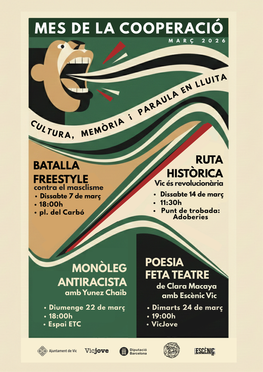 • Dissabte 14 de març: Ruta històrica Vic és revolucionària, un recorregut que explora la història social de Vic i les organitzacions col·lectives que han deixat empremta.