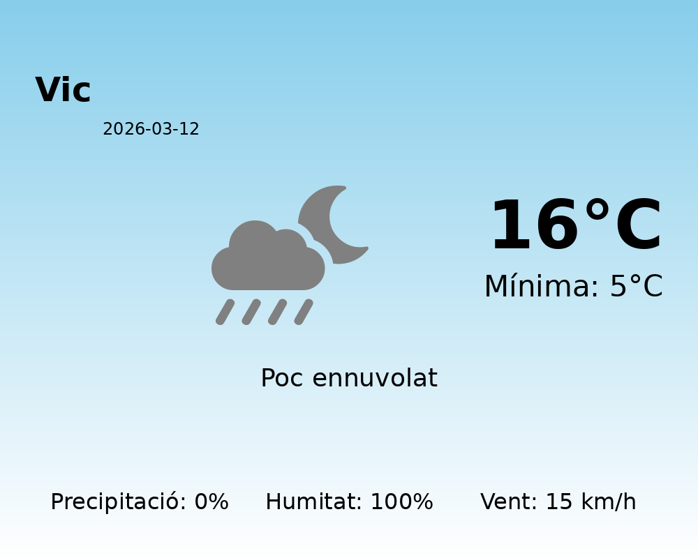 Avui, la ciutat de Vic gaudirà d’un dia relativament estable amb condicions meteorològiques favorables. Es preveu una temperatura màxima de 16 graus i una mínima de 5 graus, proporcionant una diada amb una temperatura agradable i còmoda per a aquesta època de l’any.