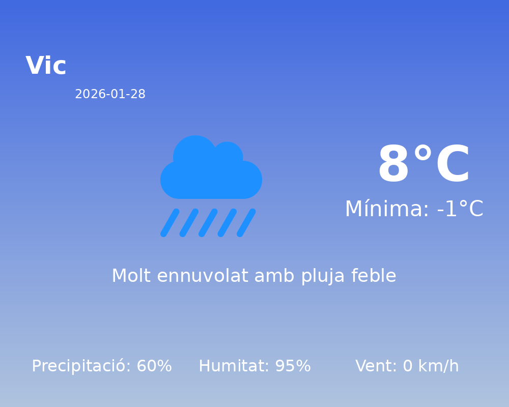 Avui a Vic, el temps serà particularment humit i fred. La temperatura màxima arribarà als 8 graus Celsius, mentre que la temperatura mínima caurà fins als -1 graus Celsius. Aquestes condicions impliquen un contrast significatiu entre el dia i la nit, així que es recomana abrigar-se adequadament.