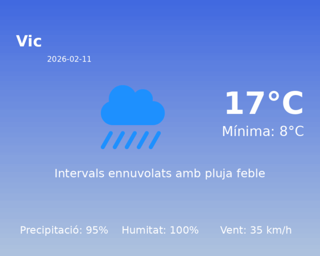 Avui, 11 de febrer de 2026, Vic experimentarà unes condicions climàtiques marcades per la inestabilitat. Es preveu una jornada amb una temperatura màxima de 17°C i una temperatura mínima de 8°C, la qual cosa és relativament suau per aquesta època de l’any. No obstant això, les condicions meteorològiques seran humides i plujoses.
