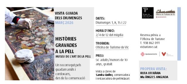 Les visites guiades, organitzades per l’Oficina de Turisme de Vic, tornaran aquest mes de març amb una activitat especial anomenada “Històries gravades a la pell”. Aquesta iniciativa es presentarà els diumenges 1, 8, 15 i 22 de març a les 11:30 del matí.