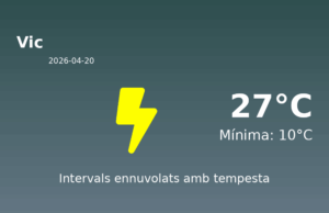 Predicció del Temps per a Vic - 20 d'abril de 2026 Avui, la ciutat de Vic experimentarà unes condicions meteorològiques força variables. S'espera que la...
