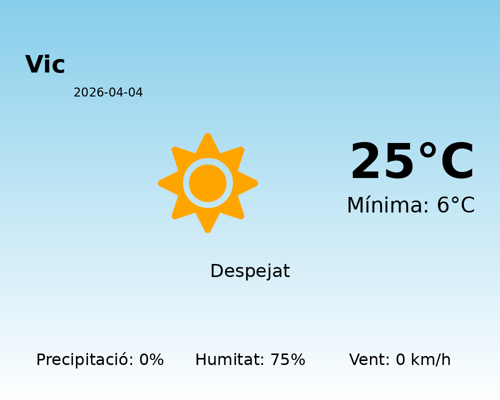 Avui, 4 d’abril de 2026, la ciutat de Vic gaudirà d’un clima força agradable. Les temperatures es mouran entre una màxima de 25°C i una mínima de 6°C, permetent una jornada amb una notable amplitud tèrmica. Això implica que l’ambient pot ser fresc a primeres hores del matí i durant la nit, però amb una notable escalfor durant el dia.