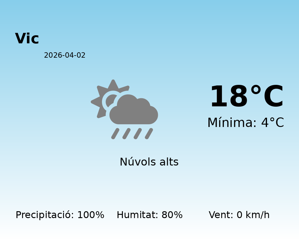 Avui a Vic, esperem un dia amb condicions meteorològiques variades. La temperatura màxima prevista serà de 18 graus mentre que la mínima arribarà als 4 graus, oferint un contrast entre el dia i la nit força marcat.